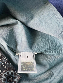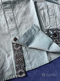 Camicia originale, azzurro effetto denim. Collo , polsini e dettaglio sulla parte abbottonata lavorata con decori .