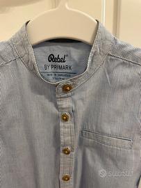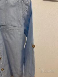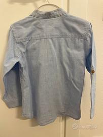 Bellissima camicie a righe celeste con collo alla coreana e bottoni i sulle maniche per poterle arrotolare e fermare. Materiale:100% cotone. Taglia: 2/3 anni, 98 cm.