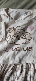 taglia XL Prenatal. color bianco e beige con stampa cagnolini all over. Ha un lembo superiore, semplicissimo da sollevare, e uno scollo incrociato sottostante, per allattare. vestibilità morbida e confortevole, è ideale da indossare anche durante la gravidanza.