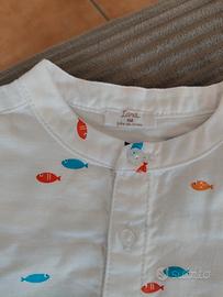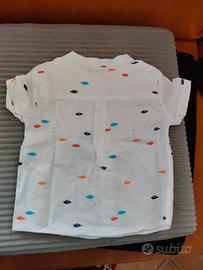 Camicia bianca mezza manica con collo alla coreana per neonato raffigurante pesciolini di colore rosso, arancione, blu e azzurro. Taglia 6 mesi. Nuova, mai indossata, solo lavata. 100% cotone. Upim