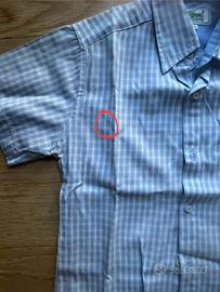 Camicia Lacoste bambino a quadretti bianco/azzurro, tg. 104. Piccolo buco come da foto