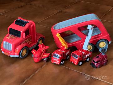 Camion con bisarca porta macchinine + 3 veicoli vigili del fuoco + 1 extra veicolo in omaggio da altro set. Premendo il pulsante i fari si illuminano e fa il rumore del motore. Il camion corre a spinta. Usato pochissimo, come nuovo.