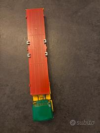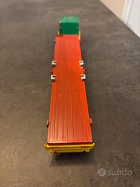 Modellino di camion Siku con rimorchio rosso. - Rimorchio piatto rosso. - Cabina del camion verde e gialla.