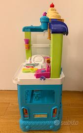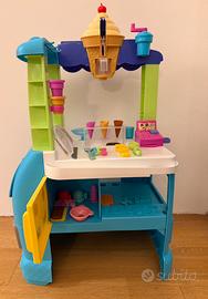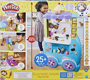 playset con camioncino dei gelati, 2 stampini a forma di pallina di gelato, stampino a forma di gelato biscotto, 4 piatti, 6 coni, stampino a forma di ghiacciolo, 2 stecche per ghiacciolo, stampino a forma di carta di credito, 2 rulli, mestolo, strumento per decorare, coltello, 3 cucchiai, spazzola, vasetto vuoto