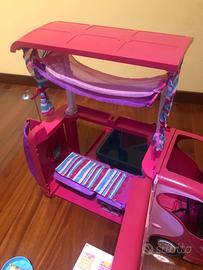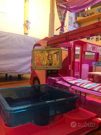 Camper delle barbie in ottime condizioni, aprendosi svela: piscina, tv, amache, cucina, letto e pure un simpatico cagnolino. Usato, ma tenuto sempre benissimo, completo non manca niente. In più aggiungo 4 barbie con i loro mille vestiti e accessori, per divertisti a cambiarle sempre! Aggiungo anche alcune stoviglie e viveri!