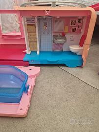 Include camper trasformabile con piscina (con scivolo e scaletta), retro apribile (con bagno e cucina), due amache e sedili anteriori che diventano sedie, accessori aggiuntivi come il tavolino per cenare, due sgabelli, utensili per apparecchiare la tavola, vivande e spazzolini da denti.