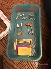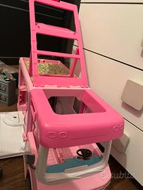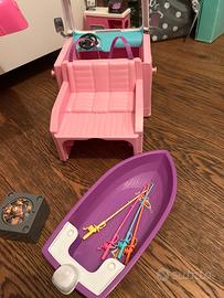 Bellissimo camper di Barbie completo di cucine con: 4 tazze, 4 piatti, 4 caraffe, 4 forchette, 4 cucchiai, 4 coltelli, latte e succo, pentola con uova e spatola, barbecue, 2 marshmellow, 2 salsicce, 2 sgabelli. Letto con sacco a pelo e copertina, macchina staccabile, barchetta con pesci e 4 canne da pesca, piscina. Con scatola originale!
