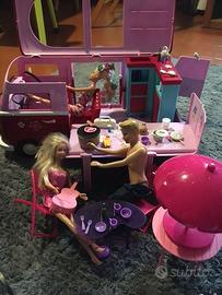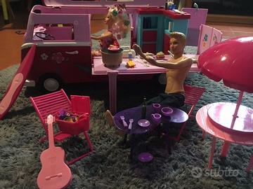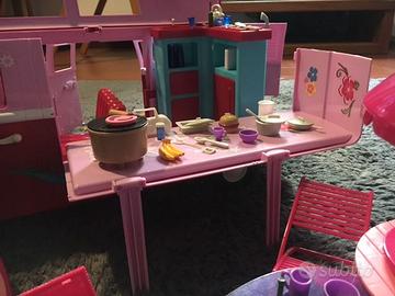CAMPER GIOCATTOLO " CALIFORNIA CAMP LOLLY" completamente apribile e fruibile in tutte le sue sfacettature. Completo di tutti i confort " extra lusso" : tavolo, tavolino, sdraio, ombrellone e doccia sul retro! Cesto per pic-nic dotato di tutto il necessario. bicchieri posate bottiglie ecc. Pentole pentolini bicchierini pietanze pronte attrezzi per barbeque tazze e teiera libri radio chitarra surf! Non manca proprio niente, pronti a partire per una bella vacanza.... PRODOTTO NUOVO!