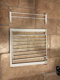 Vendo cancelletto di sicurezza con prolunga per una larghezza totale di 86 cm (71 cm il cancelletto + 14 cm di prolunga) estendibile fino a 92 cm aprendo al massimo i quattro piedini laterali per il fissaggio. Il cancelletto sì può utilizzare con o senza prolunga. Sì può fissare senza il bisogno di bucare la parete. Usato ma tenuto con cura pari al nuovo!