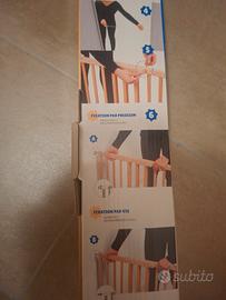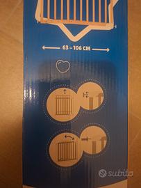 cancelletto per bambini, usato poco, ben tenuto, come nuovo, 63 cm allungabile fino a 106, si può fissare al muro o usarlo a pressione senza fare fori sul muro, comodissimo da fissare e togliere, molto resistente, in legno.