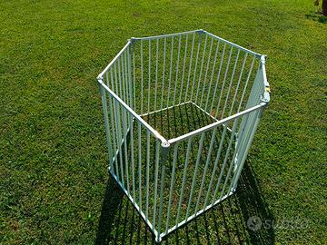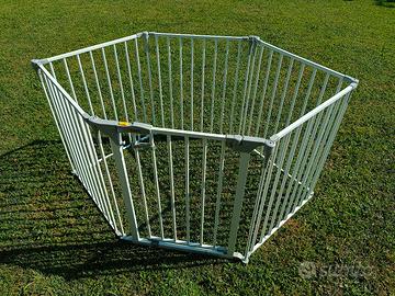 Vendo cancelletto di sicurezza per bambino marca Hauck (nota ditta tedesca), stabile e robusto in acciaio verniciato colore bianco usato poco e in ottime condizioni. Formato da 6 elementi pieghevoli di cui uno con apertura con serratura di sicurezza. Lunghezza totale sviluppo 360 centimetri circa. Completo ti supporti da muro e morbido cuscino colorato per far giocare all'interno dello spazio il vostro bambino.