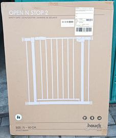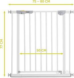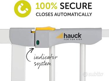 hauck Cancelletto di Sicurezza per Bambini Autoclose N Stop 2 - Cancelletto per Bambini per Aperture da 75-80cm - Fissaggio a Pressione, Chiusura Automatica - Porte e Scale Interne - Metallo, Bianco. CHIUSURA AUTOMATICA: il cancello bimbi si chiude automaticamente grazie alla serratura magnetica. L'indicatore verde/rosso mostra se il cancello è ben chiuso. Ideale per bambini e animali domestici FISSAGGIO: il cancelletto estensibile è adatto a porte o scale con una larghezza di 75-80 cm, può essere fissato in modo sicuro e stabile con quattro viti regolabili, senza bisogno di forare SICURO PER I PICCOLI: il doppio fermo di sicurezza impedisce l'apertura incontrollata del cancelletto scale per bambini, gli adulti possono aprire la porta in entrambe le direzioni con una sola mano ESTENSIONE: con le estensioni di 9 o 21cm (vendute sep.), il cancelletto bambini si estende in modo flessibile e si fissa alle ringhiere con profili rotondi con gli adattatori Y (venduti sep.) AUTOREGOLANTE: l'inclinazione iniziale della parte laterale, verrà eliminata stringendo le viti di fissaggio nel telaio. Così facendo si renderà il cancelletto Hauck molto stabile.