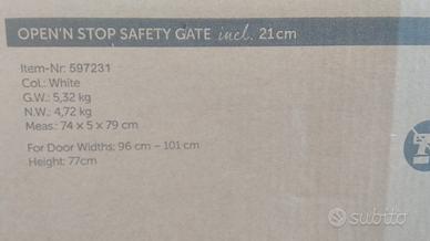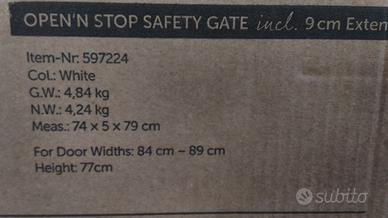 Cancelletto di sicurezza per bimbi, in perfette condizioni. Prodotto dalla HAUCK misure 74x5x79 cm ( per aperture da 96cm-101cm ) con estensione pannello da 9cm color bianco senza alcun graffio o altro segno di usura da spedire nell'imballaggio originario.