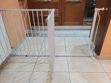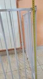 Cancelletto Sicurezza per Bambini con Sistema di Chiusura Automatica, per Aperture da 73-80 cm Estensibile Fino a Max 142 cm con Estensioni Comprese, in Metallo Bianco. Si monta facilmente a pressione senza dover forare il muro. Come nuovo, utilizzato poco più di un anno per evitare che il bimbo entrasse in cucina.