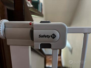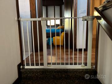 Cancello per scale adatto per bambini. Dimensioni da 65 a 110 con prolunghe. Non necessita di nessun fissaggio esterno.