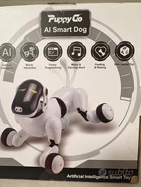 Cane giocattolo interattivo, caricabile tramite USb, comandato tramite App o tramite comandi vocali in lingua inglese. Dimensione 26x14x24.