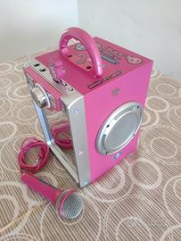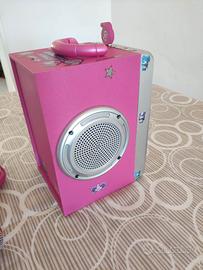 Vendo nuovissimo Canta Tu Sing Alone con connessione Bluetooth e chiavetta USB con 5 musiche Miracle Tunes. App con canzoni e lyrics da scaricare su smartphone per leggere il testo delle canzoni direttamente sullo schermo del telefono o tablet. Maniglia e casse stereo con effetto metal. Sul display si illuminano led a ritmo di musica con effetto 3D. Incluso un microfono gioiello con predisposizione per il secondo microfono, una chiavetta USB con le musiche originali. Misure 18,2x34x22 cm. Articolo in eccellenti condizioni estetiche e funzionali.