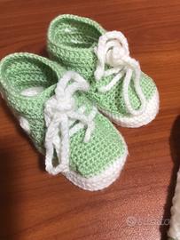 Cappellino e scarpette bimbi sono di lana lavorate a mano a uncinetto , circonferenza cappellino 30-32cm , profondità 12cm, scarpette misura 12cm, (per6-9mesi), mai indossate