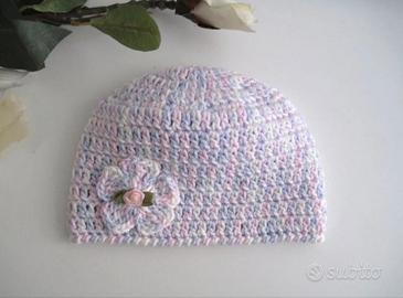 Cappellino neonata (1-3 mesi), realizzato a mano all'uncinetto in puro cotone cablè melange dalle sfumature bianco/rosa tenue/lilla, decorato con un delizioso fiorellino. Per qualsiasi informazione non esitate di contattarmi.
