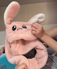Vendo cappello a forma di coniglio rosa con orecchie alzabili schiacciando la punta della sciarpa
