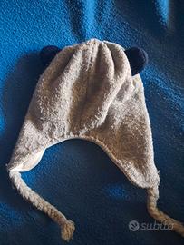 Cappellino per bambino/a marca Prenatal taglia 12-24 mesi. Il cappellino raffigura un orsetto con orecchie, naso ed occhi. Esterno lana interno pile.