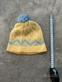 Cappellino in lana e alpaca per neonato, con un allegro disegno a zig-zag e puntini. - Colore giallo con dettagli azzurri. - Morbido pompon azzurro sulla sommità. - Ideale per proteggere dal freddo. Milano piazzale lodi o Bergamo malpensata
