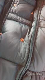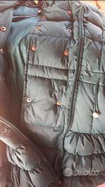 cappottino trapuntato verde taglia 10 anni (veste fino a 14), doppiopetto, cappuccio e coulisse in vita, bottoni gioiello