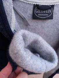 Cappotto montgomery con alamari, con cappuccio, in pura lana vergine per bambina o bambino, taglia 5 anni, 110cm. Marca Giesswein, made in Austria. Colore blu e grigio chiaro (le foto fatte in esterno con luce naturale rendono perfettamente il colore).