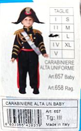 Costume di Carnevale in buone condizioni come da foto. Costume di Carabiniere in alta Uniforme completo di cappello, cintura e copri scarpe. Taglia III - età 3 anni