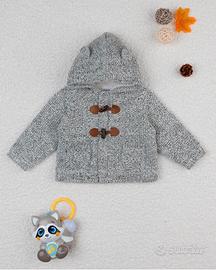 Cardigan NUOVO da bambino. Capo con cappuccio ed in total grigio chiaro. Bottoni ad asola in bordeaux. Adatto per occasioni casual. 1-3 Mesi, 56cm. Ideale per regalo.