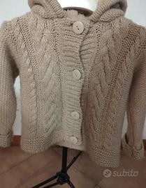 Prezzo Ribassato da 10 a 5€. Cardigan per neonata 12-18 mesi (80 cm) della linea Fagottino colore Beige. Presenta una classica lavorazione a maglia con motivi a trecce in rilievo, tipica dei capi invernali, caratterizzato da grandi bottoni tondi, che facilitano l'apertura frontale, e dalla presenza di un cappuccio. Per questo tipo di lavorazione "tricot" vengono impiegati filati morbidi in misto lana, acrilico o viscosa per garantire calore. Condizioni del prodotto Ottime. Il capo viene venduto sanificato e confezionato vedere ultima foto.