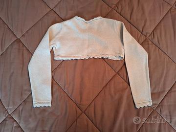 Cardigan manica lunga Mayoral per neonata con chiusura con bottone sul colletto. Modello corto bolerino. Composizione 49% cotone, 28% poliestere, 19% poliammide e 4% fibra metallica. Colore tapioca. Taglia 5 (110 cm).