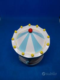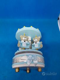 Carillon a forma di giostra con orsetti e fascia in Argento (AG 1G). Base azzurra decorata con fiocco. Tettuccio a spicchi bianchi e azzurri con palline gialle.