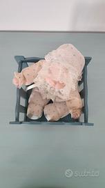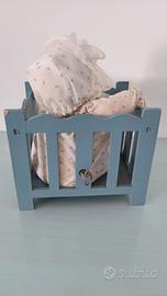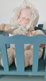 Piccolo box in legno (cm 16,5 x 13) all'interno bambolina di pezza con viso in porcellana che ondeggia il capo dal sonno. Classic0 tema musicale da carillon e movimento che si attivano girando una chiavetta sul retro. Old style delizioso ...