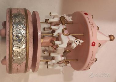 Carillon musicale a forma di giostra con cavallini bianchi, realizzata in legno rosa con applicazioni in Argento bilamina della prestigiosa azienda De Marco