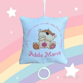 Carillon personalizzabile con disegno a scelta o nome da attaccare alla culla o alla carrozzina. Ricamato a mano con matassine DMC su tela aida e foderata con cotone fantasia .