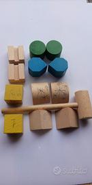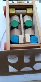 16 forme geometriche da incastrare nel pannello superiore del carrettino tutto in legno, aiutandosi anche con il martellino anch'esso in legno. Giolco bambini che trasporteranno ovunque tirandolo con la cordicella a lui legata. Il pacco misura 34 x 20 x 10 Kg 1