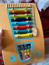 Carrellino multi attività / gioco, che il bambino puo spingere mentre fa i primi passi. Puó caricare oggetti sulla mensola nel retro, suonare con i bastoncini o con il plettro in legno. Fornito smontato nella scatola originale. Presenta qualche segno di colore (vedi foto) ma è pulito e funzionante. Manca la scatola con le formine in legno. Janod è una marca francese nota per giochi in legno di qualita e design.