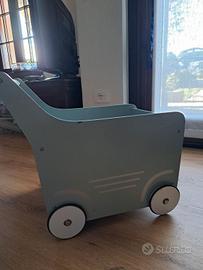 In legno, ottime condizioni. Consente al bambini di muovere i primi passi appoggiandosi ad un supporto. L' avevo scelto perché differentemente da quelli in plastica le rotelle non scivolano in avanti (sono ricoperte da una guarnizione in gomma che protegge il bambino ...e il parquet...)