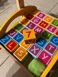 Carrellino in legno per primi passi ma anche con cubi lettere alfabeto e numeri. I cubi possono essere usati anche per torri e costruzioni.