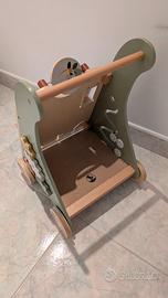 Simpatico carrellino in legno utile per i primi passi del bambino con tanti giochi frontali e laterali di tipo montessoriano.