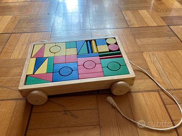 Carrello trainabile costruzioni in legno con 36 blocchetti colorati di varie forme