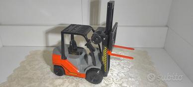 Muletto giocattolo per bambini, con carrello elevatore funzionante grazie all'apposita rotella posta fuori la cabina
