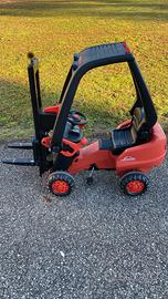 Carrello elevatore/trattore a pedali giocattolo marca Linde. Munito di nr. 1 bancale e con staffe sollevabili e abbassabili. Un paio di note: una staffa è stata riparata come da foto e il meccanismo di sollevamento modificato. Per il resto perfettamente funzionante.
