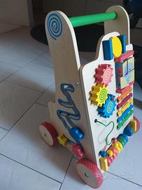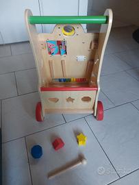 carrello in legno "howa " come nuovo ( ancora scatola originale): altre ad avere la funzione di accompagnare i bambini ai primi passi e alla deambulazione, è costituito da giochi logici e sonori, comprensivo in 3 incastri e martelletto come da foto in scatola originale.