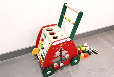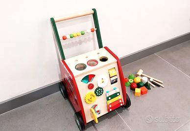 Carrello primi passi in legno multifunzione per bambini, completo di numerose attività educative in stile Montessori. Perfetto per stimolare coordinazione, motricità fine, logica e riconoscimento di forme e colori.