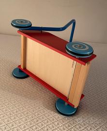 Realizzato in legno, molto solido, adatto a molteplici usi a cui il bambino lo potrà sottoporre come veicolo preferito. La stabilità del carretto è data dal peso e dalla solidità della struttura, pur non avendo le ruote frenate.