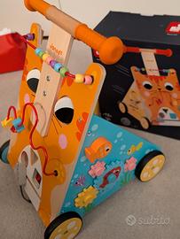 Miaaao! Fate largo al felino più adorabile del mondo! Il nostro gatto rosso con gli occhi grandi è sempre pronto per passeggiate e avventure con il tuo bambino! Questo carrello in legno multi-attività accompagnerà i bambini da 1 anno grazie ai tanti piccoli giochi sui suoi 3 lati! Ci divertiamo e sviluppiamo le nostre capacità motorie e destrezza con le 8 divertenti attività del nostro gatto intelligente: percorsi con pesci, gioco a incastro tradizionale, un piccolo topolino da far scivolare da un lato e ingranaggi e pulsante sonoro del fondale marino dall'altro. I grandi occhi del nostro gatto ruotano e le sue guance sono fatte di feltro per sviluppare il tocco del bambino. Questo grazioso carrello a spinta è particolarmente adatto per imparare a camminare. Grazie alla sua maniglia regolabile in altezza (da 47 a 53 cm), è scalabile e si adatta alle dimensioni del tuo bambino. Può così accompagnarlo da 12 mesi a 3 anni. Per sicurezza, è dotato di un freno invisibile e rimovibile che consente di bloccare le ruote (a 12 mesi) e rilasciarle gradualmente al fine di controllare la velocità del carrello durante l'apprendimento. Infine, con le sue 4 ruote in gomma silenziose, non segna il terreno!