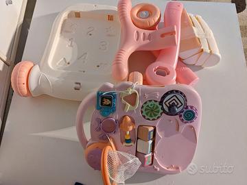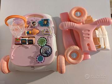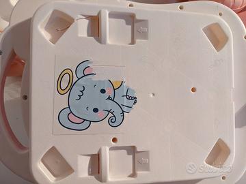 girello primi passi che tavolino da gioco. Il carrellino ha la possibilità di tenere le ruote ferme con sistema di bloccaggio. Tanti giochini tattili e Pianoforte elefantino. Il dorso della base gioco è leggermente scheggiato,ma non è accessibile ai bimbi.