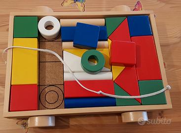 Vendo carrettino giocattolo con puzzle Ikea in legno, in ottimo stato, ancora con tutti i pezzi e il cordino per trainarlo.